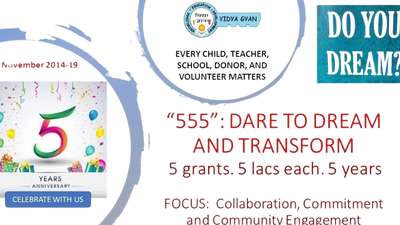With Vidya Gyan completing five years since its inception in 2014 and the experiences gained, we wanted to do something more transformational. We realized that a sustained transformation necessitates a bigger investment by Vidya Gyan, the teamwork and commitment by teachers, and the engagement of the village community for building pride in the school. With that in mind, our donors/friends dared us to dream a bold move i.e. to encourage and empower teachers to think “outside the box” to foster partnerships with community/parents and create an engaging learning environment. That led to Vidya Gyan’s Dream to award 5 grants up to Rupees 5 lacs each ($7,500) over a period of up to 5 years (“555”) to effect teacher-directed change toward sustainable improvement.